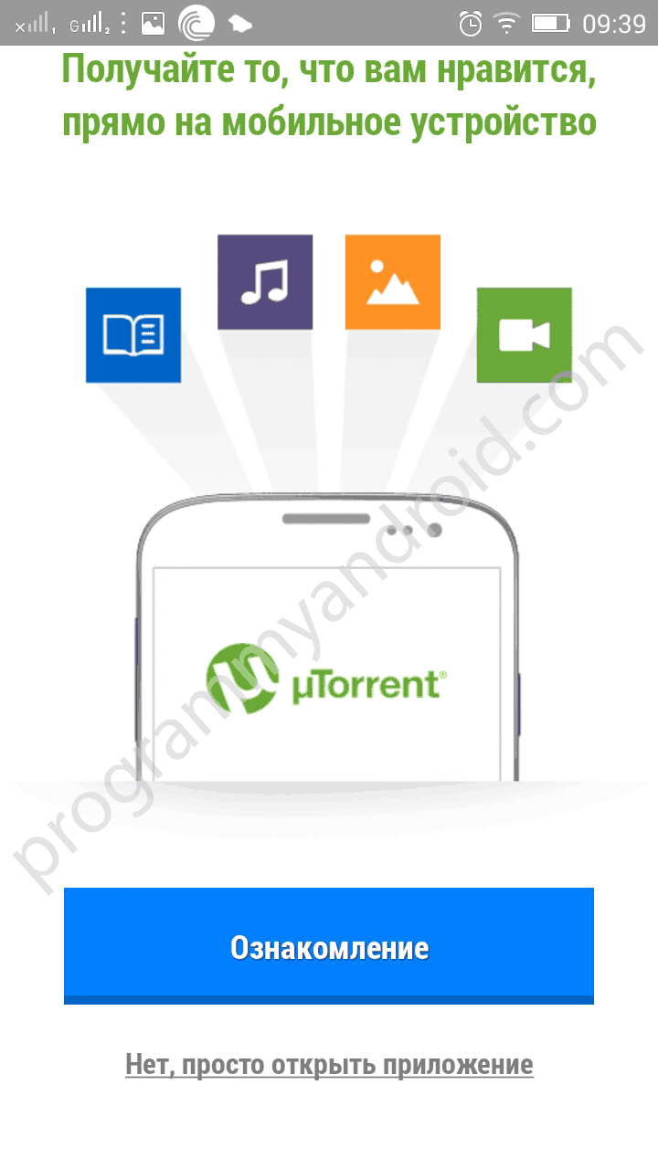 The application for downloading videos, audio files and text documents works on Android phones and tablets. To start working with the application, you need to download of the torrent client for Android for free without registration and SMS. Also on this page you can read the description and see screenshots of the application. Permanent link: https://programmyandroid.com/en/communication/utorrent for repeat visits.